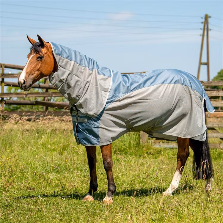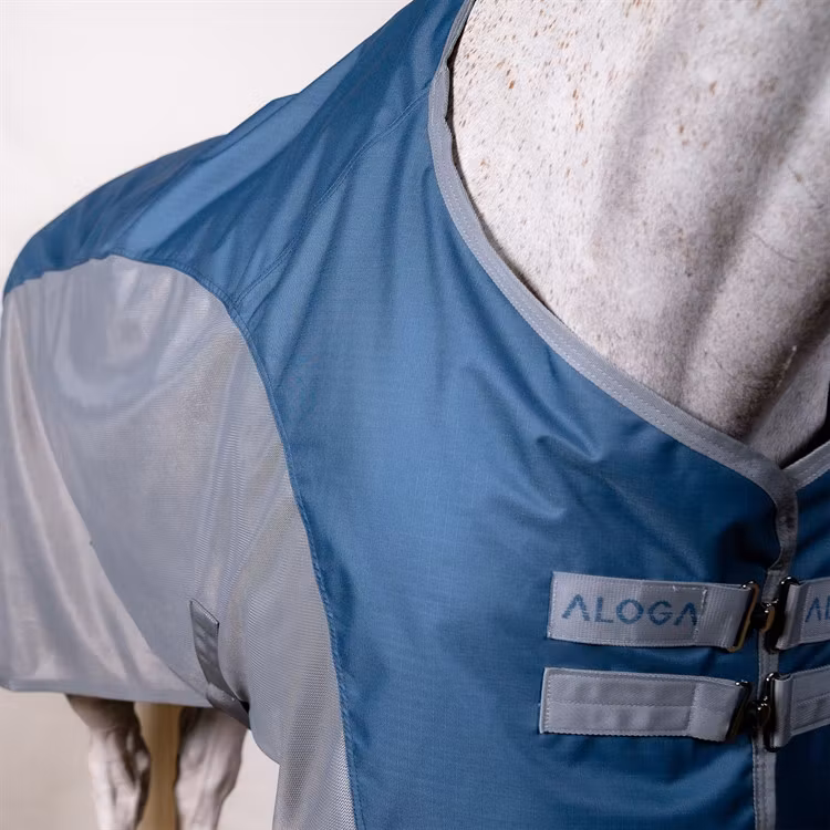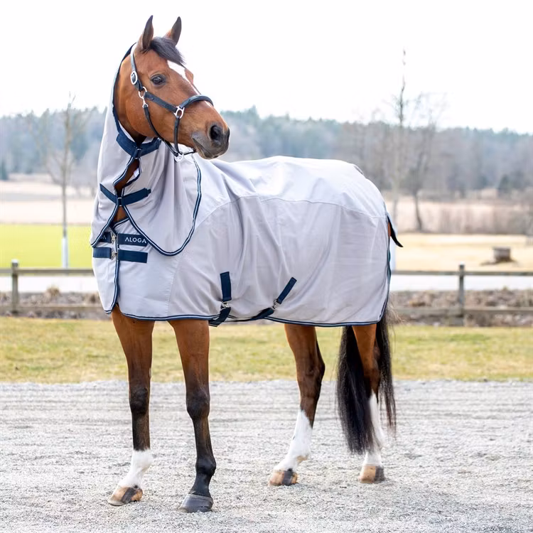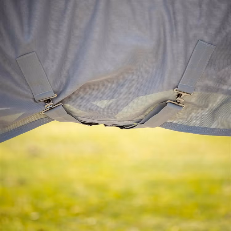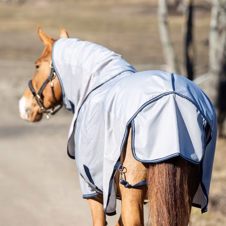 - Andningsbart fly-meshmaterial: Stickad polyester-mesh skyddar mot flugor och ger optimal luftcirkulation. Täcket motverkar överhettning och håller hästen sval och bekväm.