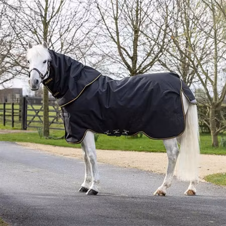 Aloga Pro Turnout 200g med halsdel är ett medeltjockt utetäcke som ger isolerat skydd när temperaturen sjunker eller om din ponny är klippt. Tillverkat i slitstark 1200D polyester, erbjuder täcket vattentätt och andningsbart skydd för ponnyer som sliter på täcken. 200 g termobunden fiberisolering värmer där hästen behöver det mest, samtidigt som god andningsförmåga förhindrar överhettning.