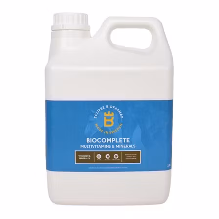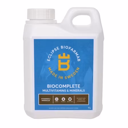 Eclipse Biofarmab BioComplete är ett heltäckande multivitamin- och mineraltillskott utvecklat för att säkerställa att hästar får ett fullvärdigt näringsintag. Produkten är särskilt lämpad när foderstaten behöver kompletteras och passar alla typer av hästar. BioComplete är berikat med fermenterad jästkultur för att optimera näringsupptaget och innehåller endast svensk honung som sötningsmedel, vilket gör det smakligt och lätt att dosera. Tillskottet innehåller essentiella vitaminer, mineraler och aminosyror som stödjer hästens hälsa och prestationsförmåga.