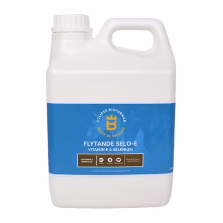 Eclipse Biofarmab Flytande Selo-E är ett flytande tillskott som kombinerar E-vitamin och organiskt bundet selen för att stödja hästens muskelfunktion, immunförsvar och allmänna hälsa. Det organiska selenet är lättupptagligt, vilket minskar risken för överdosering och säkerställer effektivt upptag. Flytande Selo-E innehåller även inulin, ett naturligt växtfiber som främjar näringsupptag och maghälsa. E-vitamin fungerar som en antioxidant som skyddar celler och muskler från skador orsakade av fria radikaler och bidrar till bättre syreförsörjning och blodkärlsbildning. Flytande Selo-E är särskilt viktigt för dräktiga ston och hästar under hård träning, där behovet av selen och E-vitamin är extra stort.