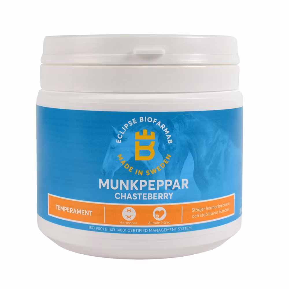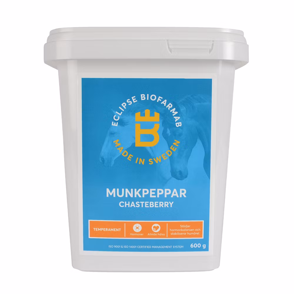 Hormonell obalans kan leda till humörsvängningar, aggressivitet, retlighet och minskad prestation. Munkpeppar hjälper stoet att balansera hormonnivåerna naturligt vilket ger henne möjlighet att slappna av. Stabiliserar humöret vid hormonrelaterade problemexempelvis vid brunstperioder. Passar lika bra till hingstiga valacker. Högsta kvalitet på råvaran. Mald för bästa upptaglighet.