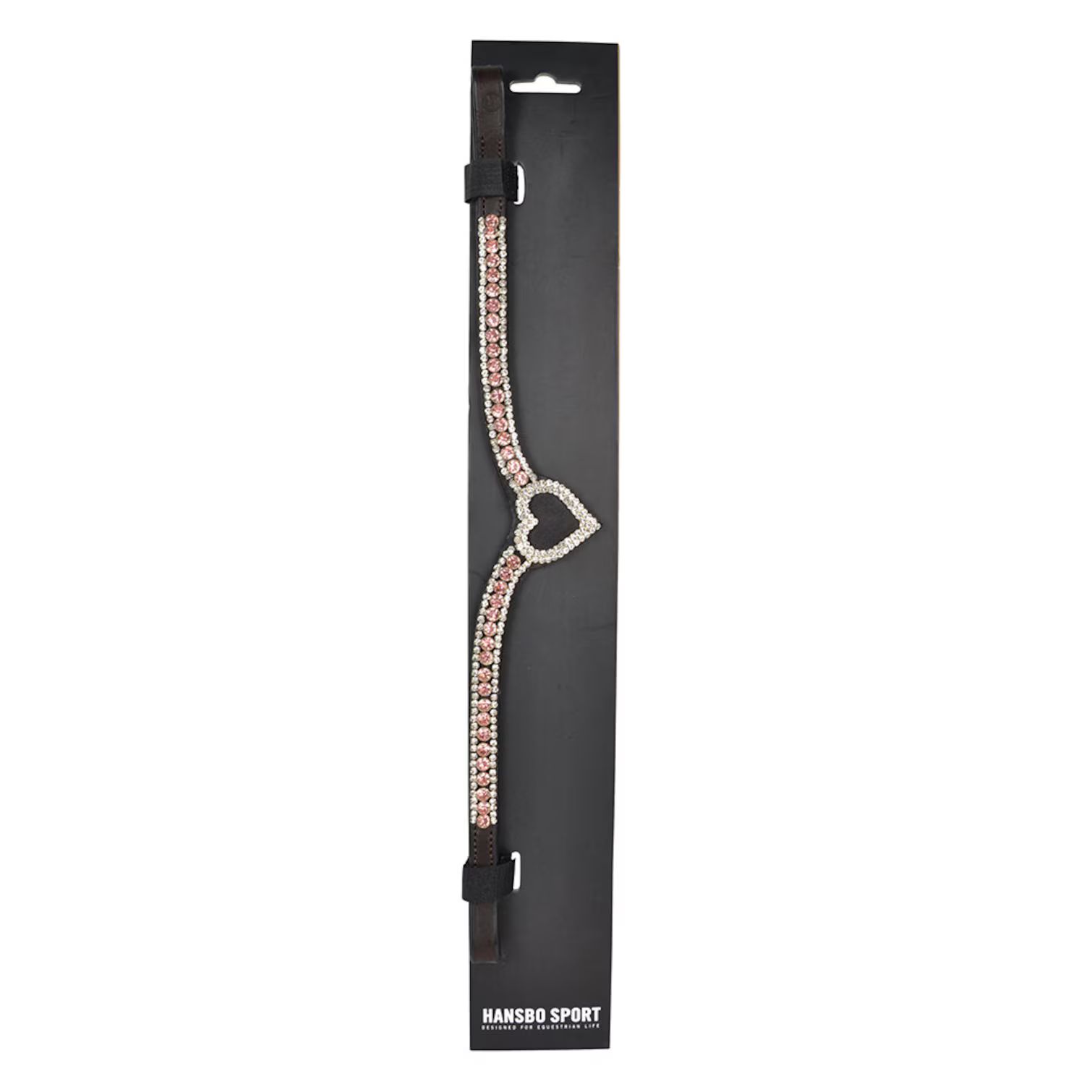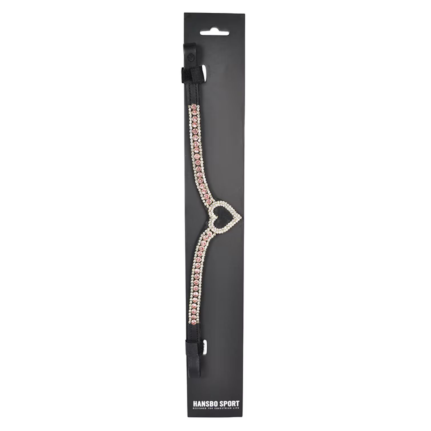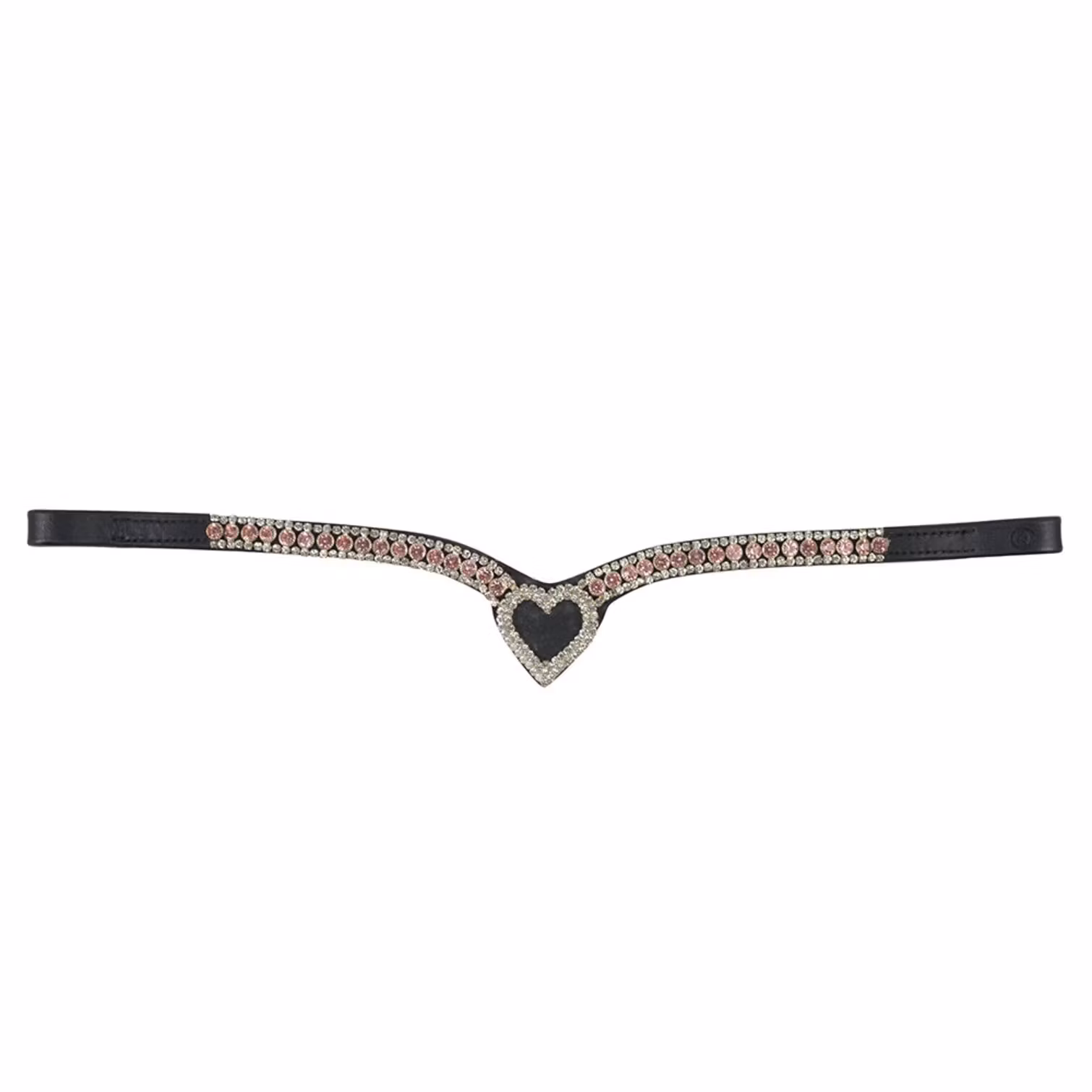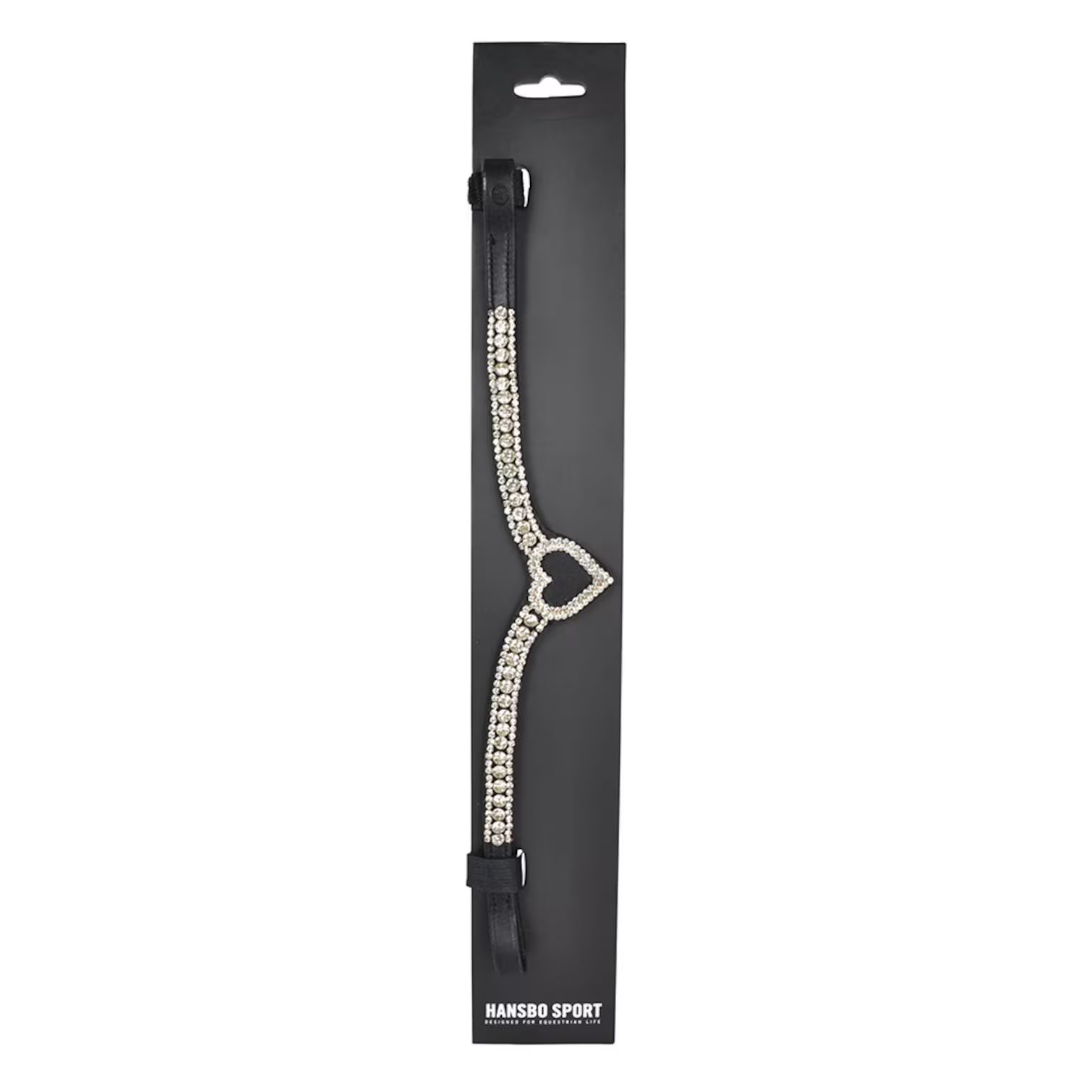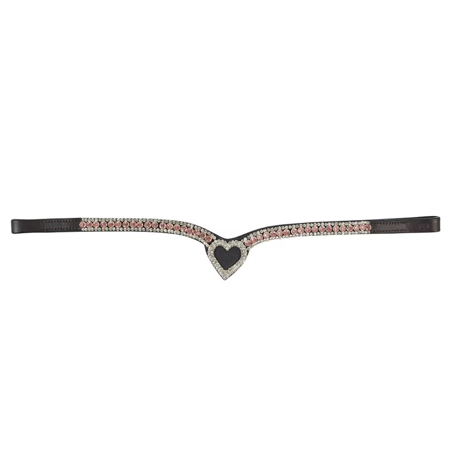 Elegant och stilrent pannband i äkta läder, utformat i en klassisk V-form som framhäver hästens huvud. Glittrande strasstenar pryder hela bandet och möts i ett vackert hjärta i mitten. Passar lika bra till tävling som till vardagsridningen när du vill sätta lite extra glans på utrustningen.
