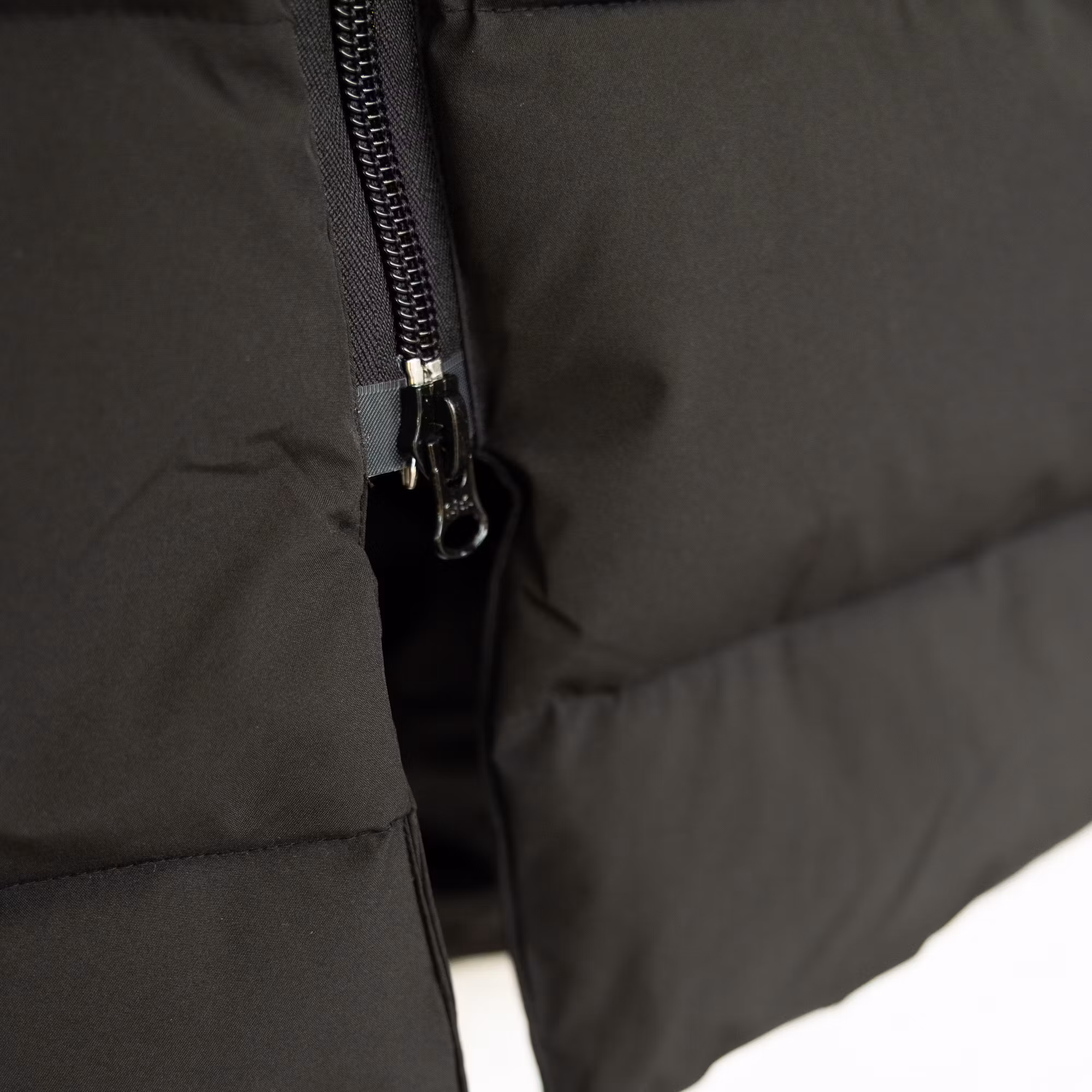 Tvåvägsdragkedja fram och fickor med dragkedjor samt innerficka. Muddar i ärmslut och stor huva som enkelt går över hjälmen.