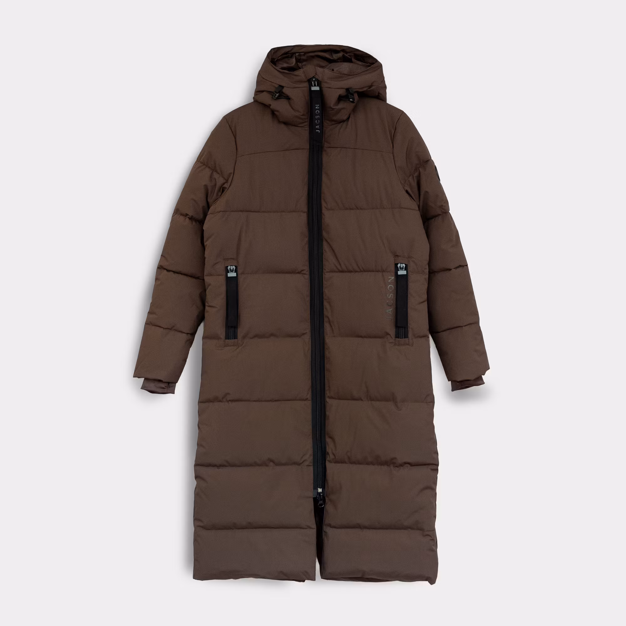 Hellång rak kappa med dunliknande syntetfyllning som finns i färgerna blå, brun och svart.