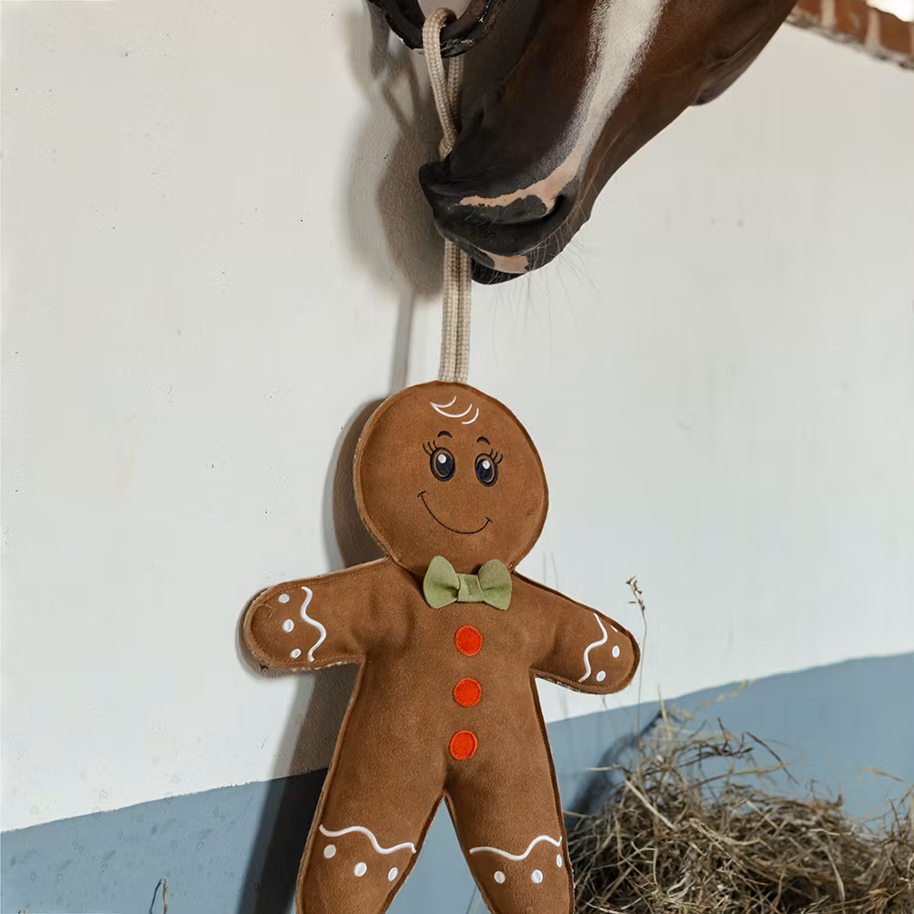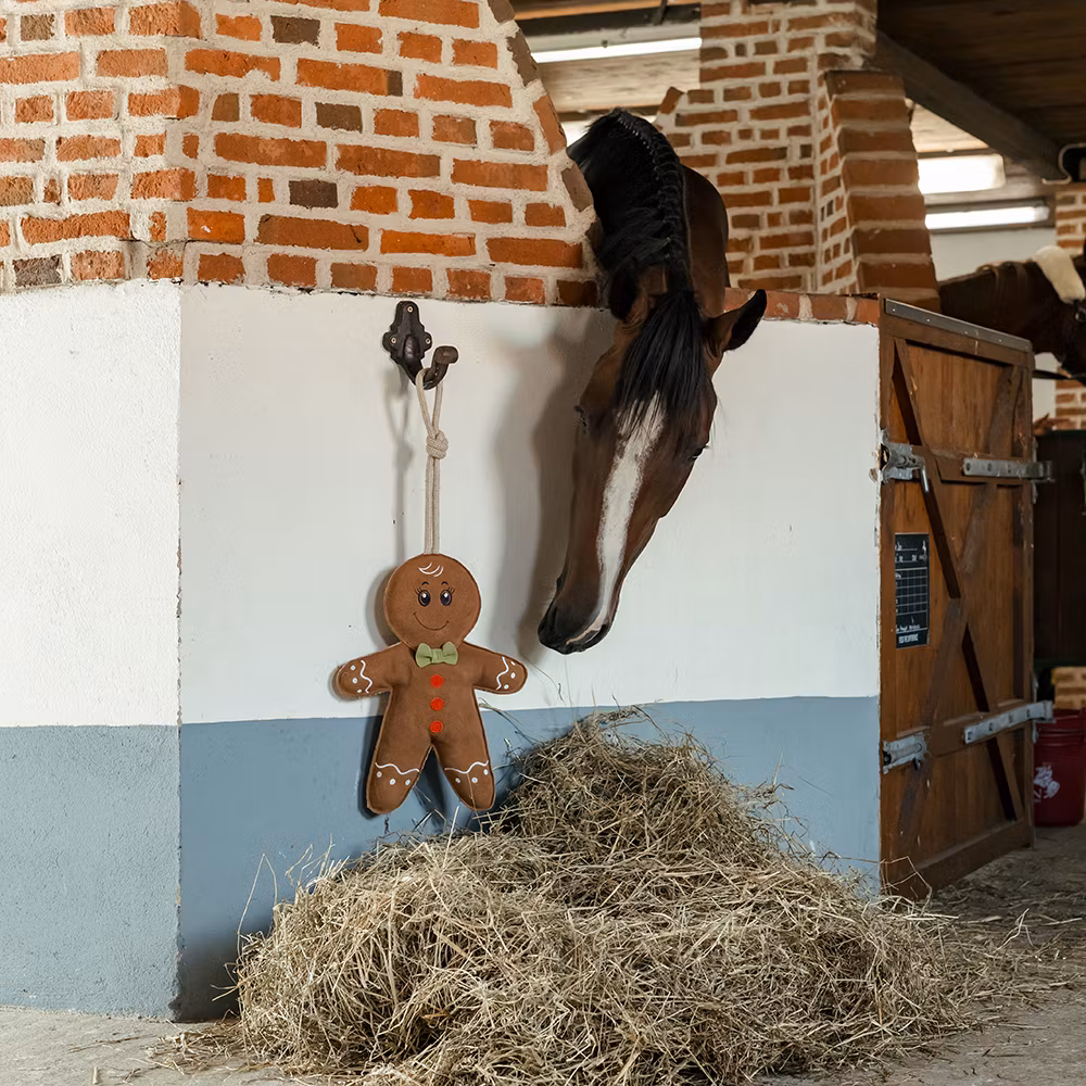 Hästleksak / Hundleksak i form av en sockersöt pepparkaksgubbe, tillverkad av mocka, fylld med Kokosnötsfiber. Optimal busiga hundar, eller för hästar som lätt blir rastlösa i boxen, då denna kan hjälpa till att sysselsätta hästen och motverka tristess. Enkel att hänga upp. Perfekta julklappen till din fyrbenta vän!