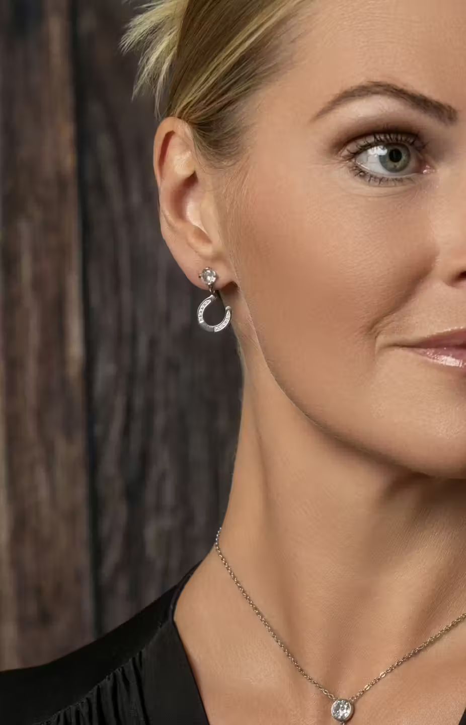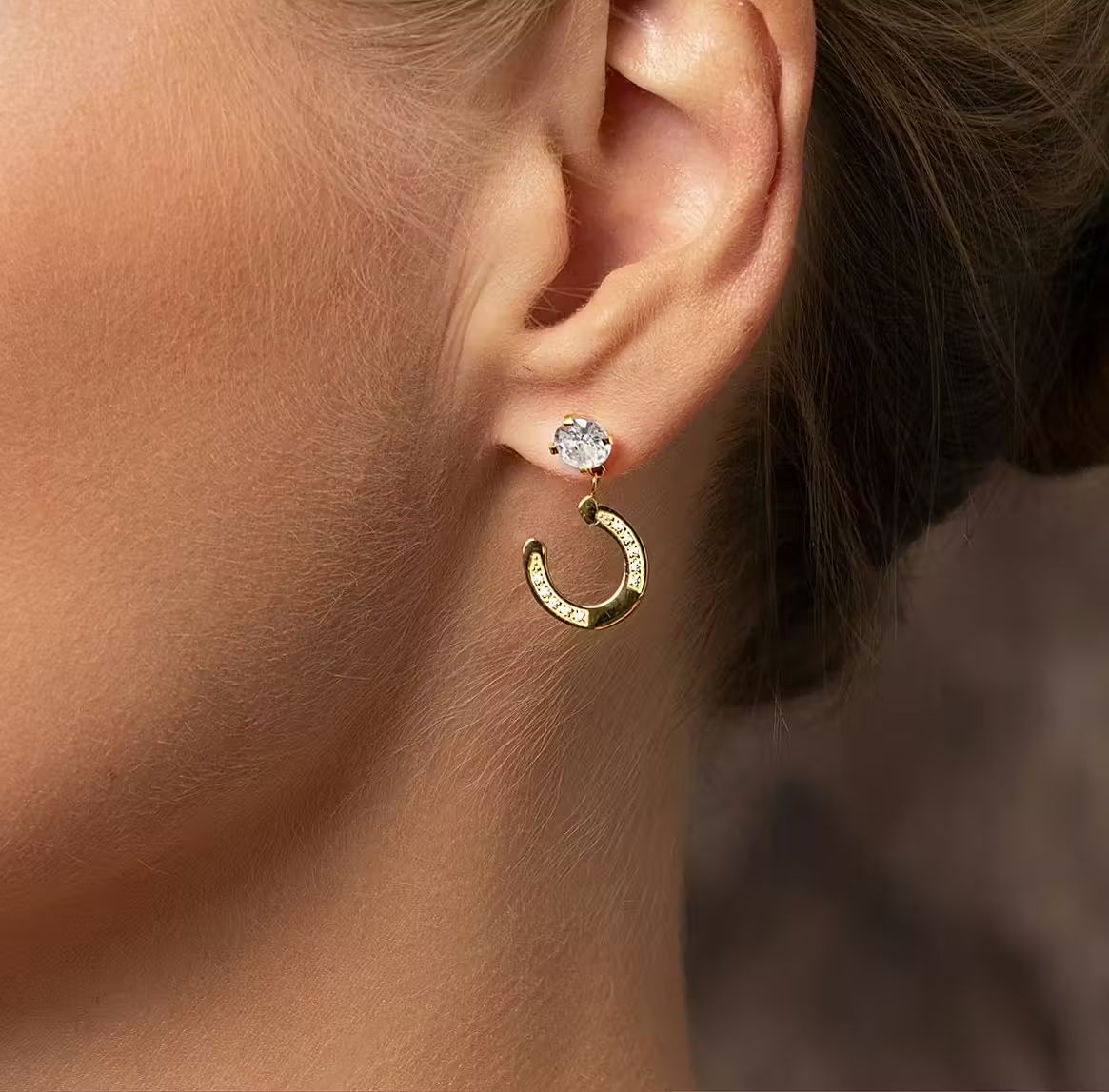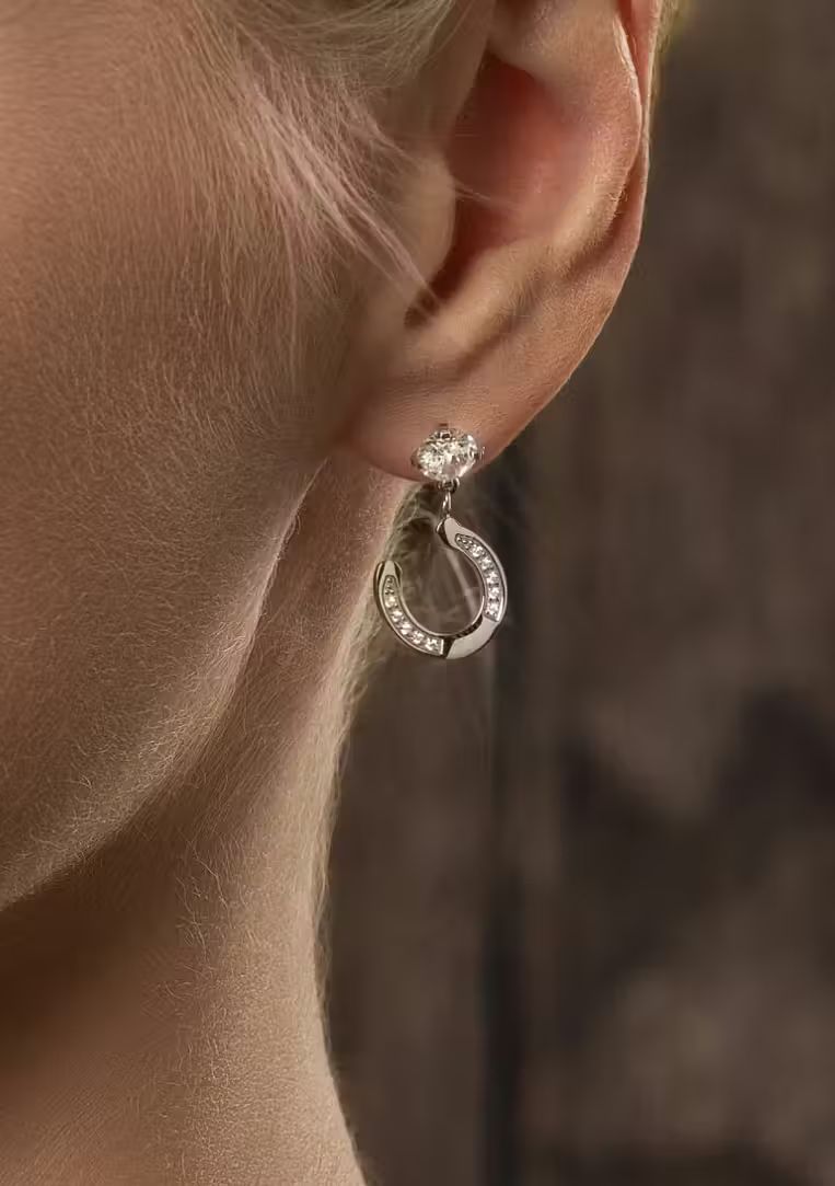 Glittrande örhängen i form av en hästsko, med en större sten i örat och små gnistrande stenar längs skon. Vackra och bekväma att bära, passar både till vardag och fest! Alla våra smycken är nickelfria och omfattas av 3 års garanti.