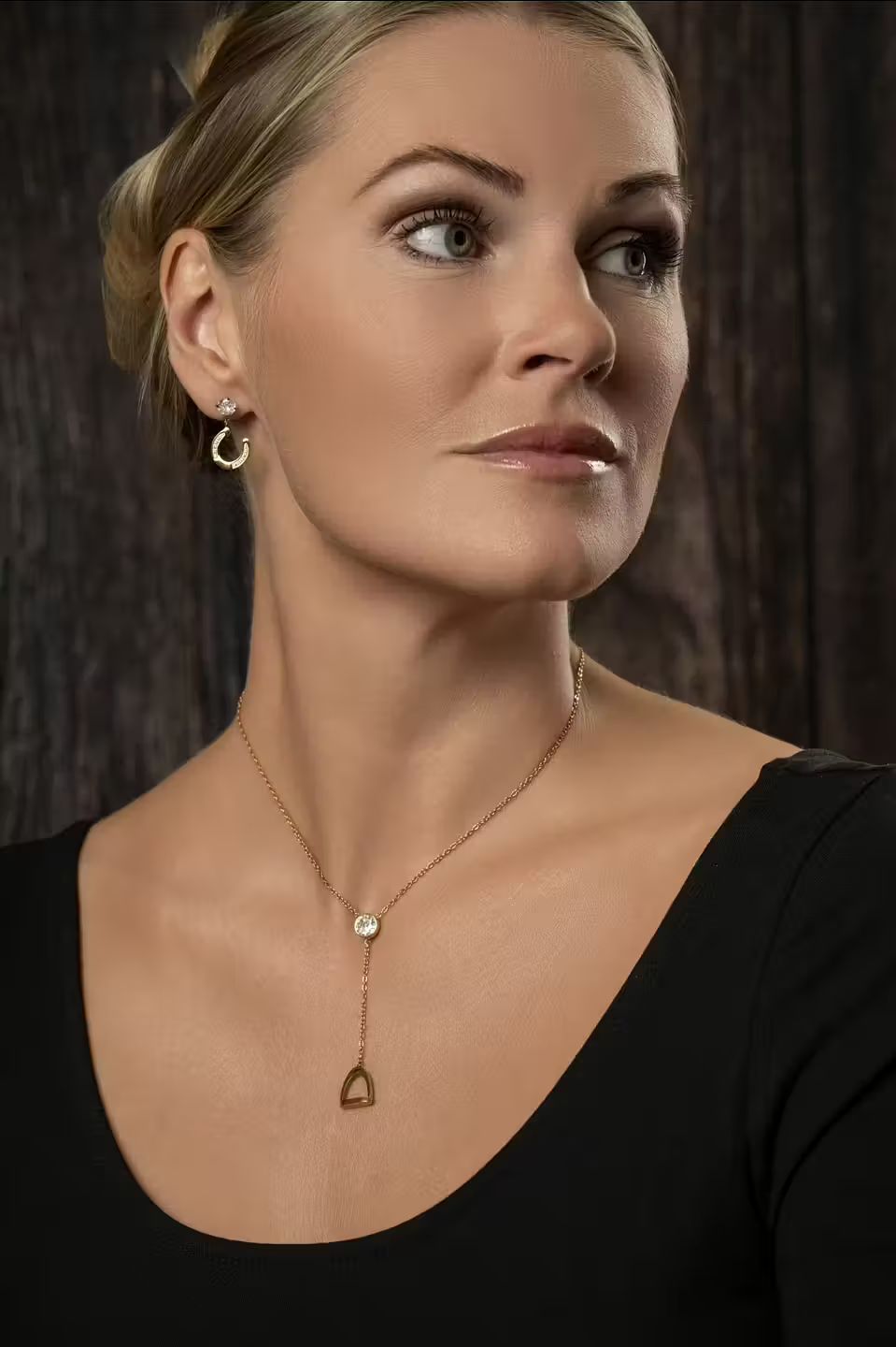 Guld - Material: Guldpläterat rostfritt stål. Kristall. Nickelfritt. Höjd: 24 mm. Hästskons bredd: 14 mm.